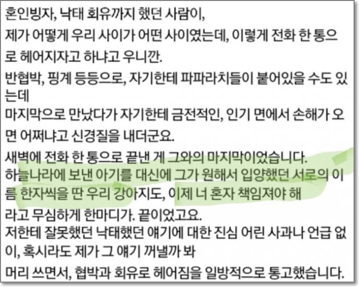 폭로 글 속에서는 낙태를 하게 한 후 그는 일방적으로 이별 통보를 했는데 하늘나라에 보낸 아기를 대신해 그가 원해서