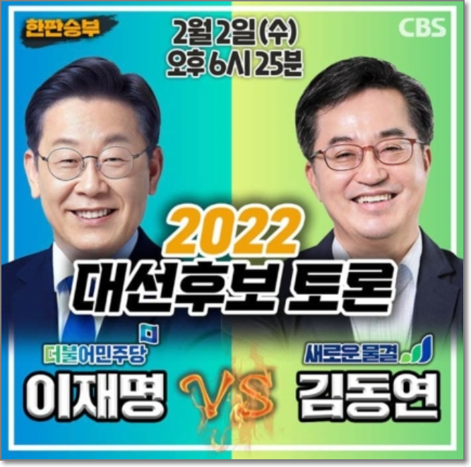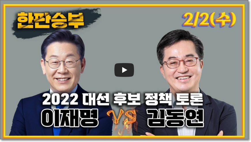 더불어민주당은 이재명 대선 후보와 새로운물결 김동연 대선 후보가 설연휴 마지막날인 2일 저녁 양자 정책토론을 개최하기로 합의했습니다. 이 후보는 4자 TV토론(3일)을 하루 앞두고 윤 후보와의 차별성을 적극 부각할 것으로 보이며, 4자 TV토론에서도 소외된 김동연 후보는 자신을 알리는 계기로 활용할 것으로 전망되는데요.