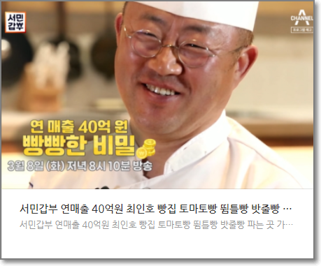 전국 방방 곡곡의 자수성가한 대한민국 슈퍼리치 서민갑부들을 찾아 맨바닥에서 시작하여 부를 이룬 서민갑부들만의 아주 특별한 성공 스토리를 알려주는 프로그램 서민갑부에서는 연매출 40억원 최인호 빵집이 소개되었습니다.