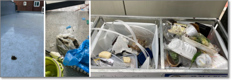 그리고, 배달음식 용기는 복도에 방치하지 말고 씻어서 분리수거해달라 부탁하니 복도가 아닌 분리수거장에 음식물 들어있는 용기를 아무렇게나 내다버려 엉망이랍니다.