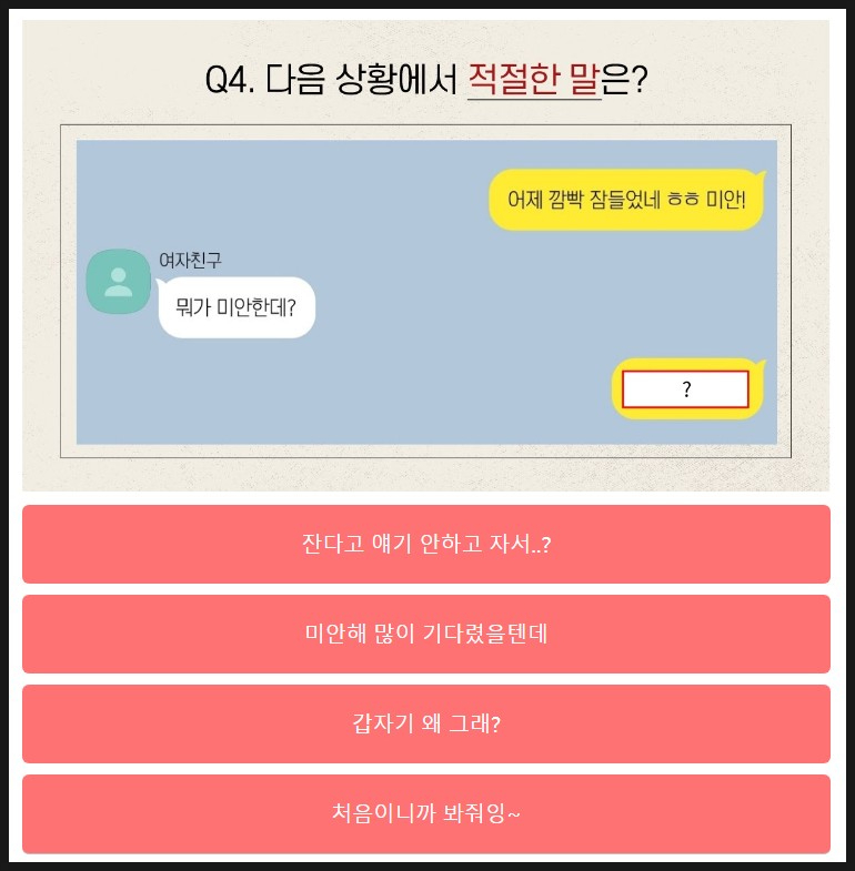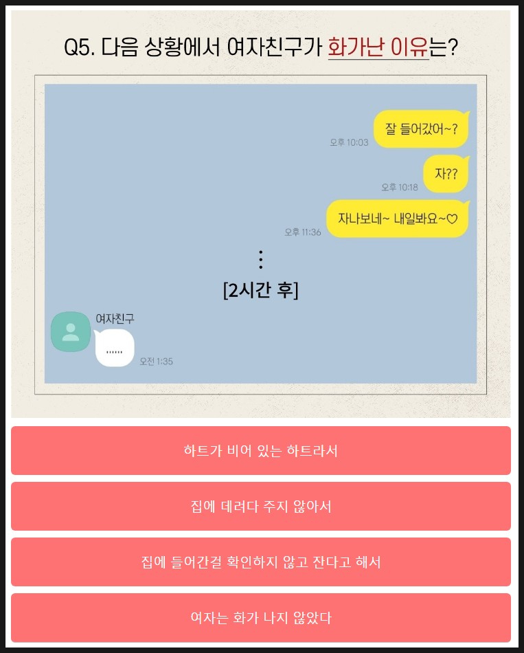 마지막 5번 여자친구가 화난 이유를 선택해야하는데요.