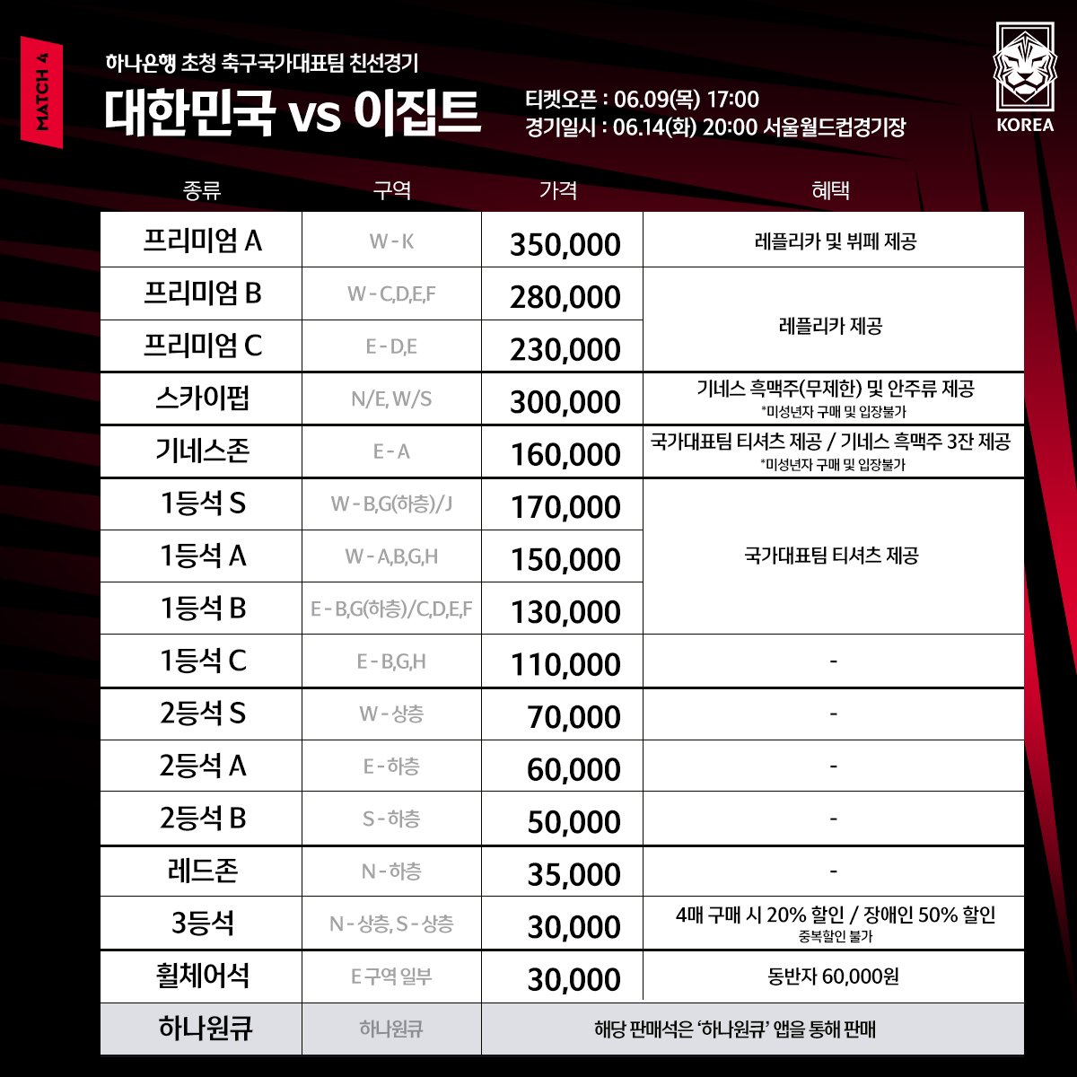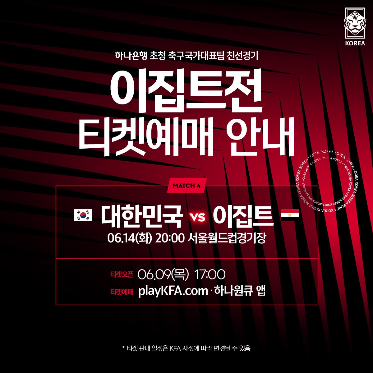 대한민국 이집트 경기 티켓은 플레이 KFA와 하나 원큐 앱에서 구매 가능합니다.