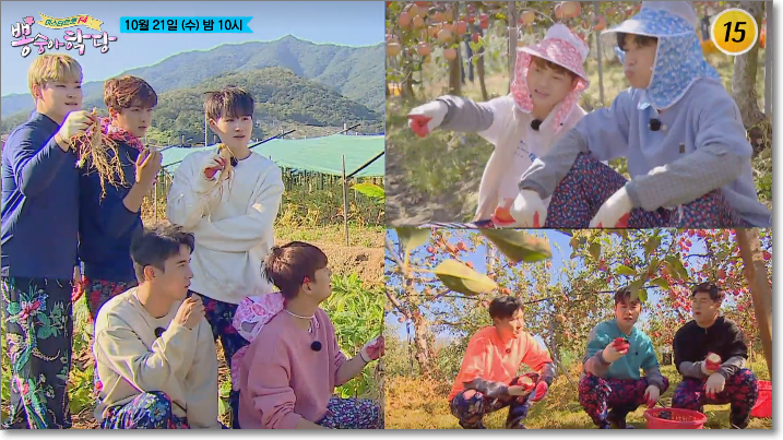 임영웅은 사과 먹방 ASMR을 도전했고 영탁은 조성모 성대모사를 하며 사과밭에서 흥겨운 시간을 보냈습니다