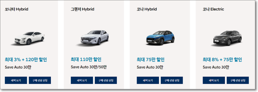 현대자동차는 승용차와 스포츠유틸리티차(SUV) 1만3000대를 2~10% 할인 판매한다. 아이오닉 하이브리드, 아이오닉 일렉트릭은 각각 6월과 9월 이전 생산 차량에 대해 10% 할인 판매한다.