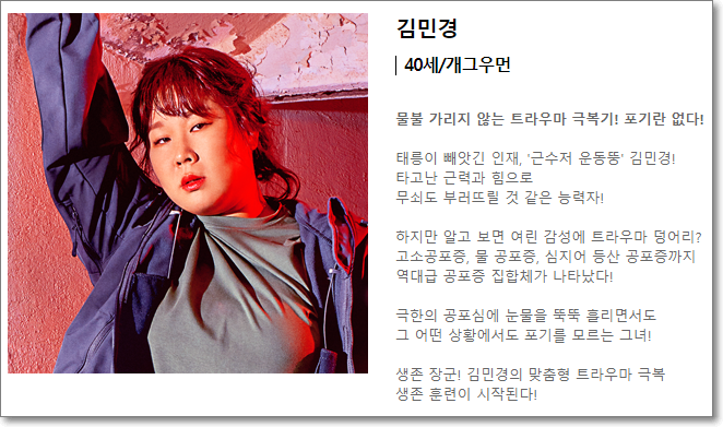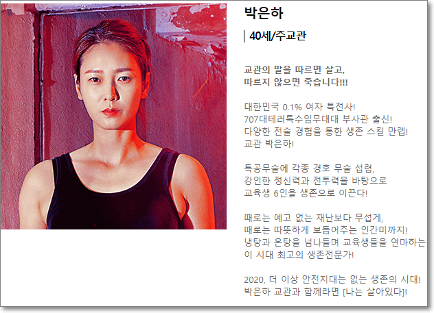 이들은 틀수전사령부 중사 출신 박은하 교관으로부터 재난 탈출 훈련과 생존 팁을 배우고 최종적으로 독자 생존에 도전하는 과정을 보여줄 예정입니다.