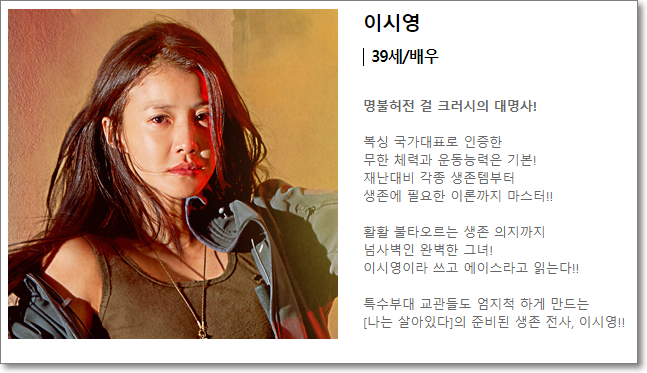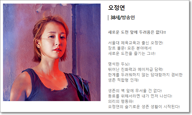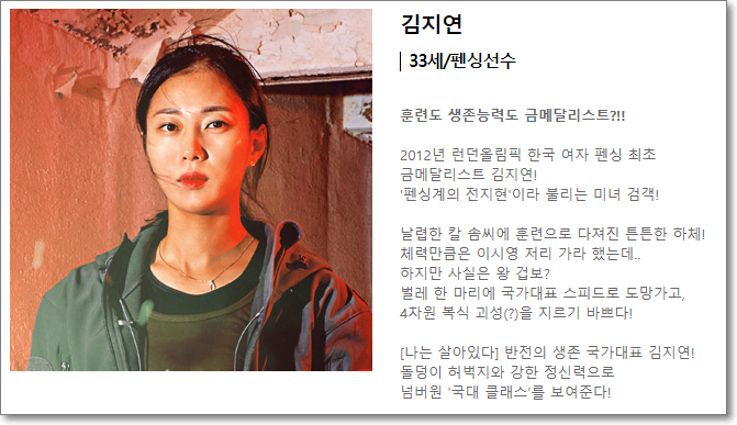 50대의 나이에도 꾸준히 운동을 하는 것으로 알려진 김성령, 복싱 국가대표 이력이 있는 배우 이시영, 웹예능 오늘부터 운동뚱에서 타고난 운동실력을 보여준 김민경, 서울대 체육교육학과 출신 오정연, 펜싱 금메달리스트 김지연 등이 생존을 위해 몸을 사리지 않는 도전을 펼칩니다.