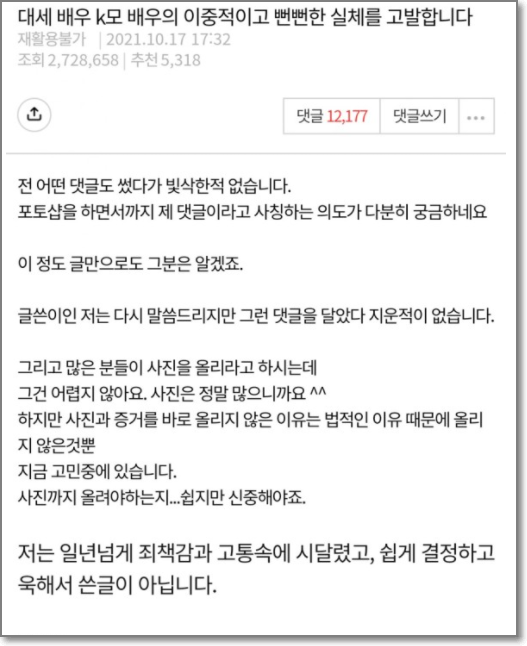 17일 한 유명 온라인 커뮤니티에는 '대세 배우 K모 배우의 이중적이고 뻔뻔한 실체를 고발합니다'라는 제목의 장문의 글이 게재됐다. 자신을 K 배우의 전 여자친구라고 밝힌 A 씨는 "지난해 초 K