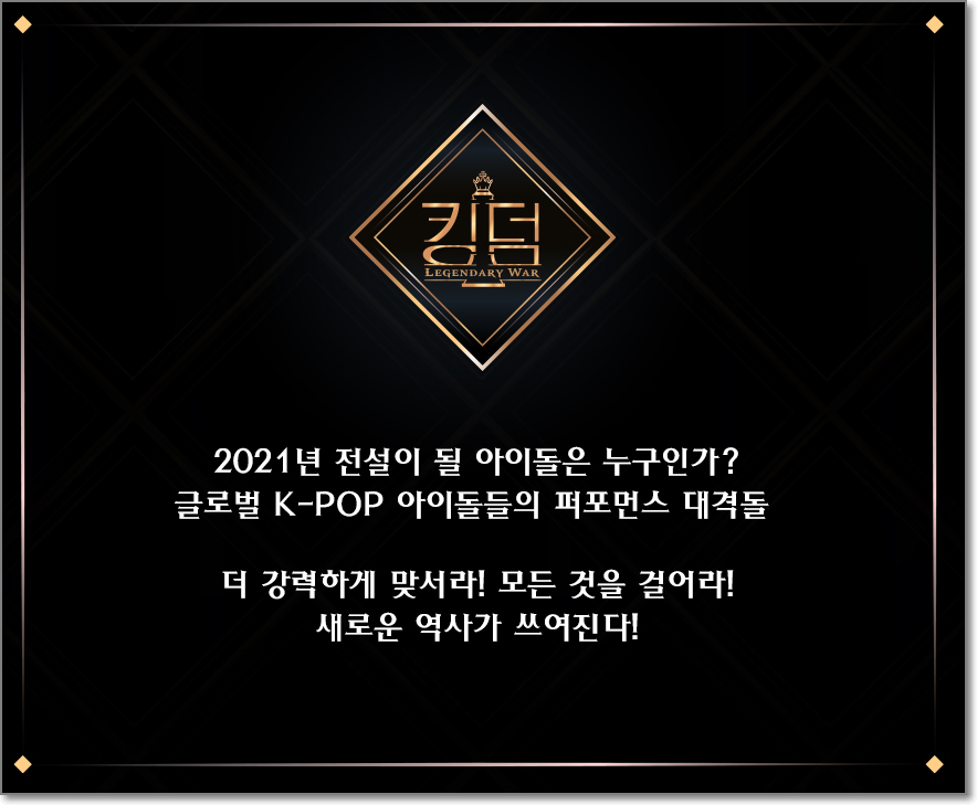 Mnet 킹덤 : 레전더리 워 Mnet 보이그룹 서바이벌 '킹덤 : 레전더리 워'는 지난해 방송된 '로드 투 킹덤' 후속 프로그램으로 비투비, 아이콘, 더보이즈, 스트레이 키즈, 에이티즈, SF9이 왕좌를 두고