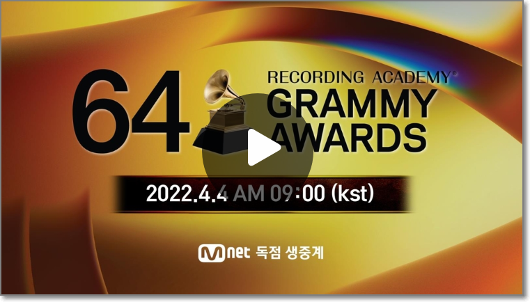 제 64회 그래미 어워드 2022년 그래미 어워즈가 시작합니다. 벌써 64회째를 맞이하는데요. 코로나로 인해 한 차례 연기되어 4월 4일(현지시간) 개최됩니다. 본방송은 mnet, 티빙을 통해 실시간 생중