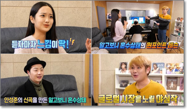 안성준과 김소연은 트로트 히트 메이커인 알고보니 혼수상태로부터 맞춤 곡을 선물 받았는데요. 두 사람을 직접 작업실로 초대해 원 포인트 레슨을 했습니다. 김소연에게는 '그대로 멈춰라'를 전달했고 안성준에게는 '마스크' 라는 노래를 선물했는데요.