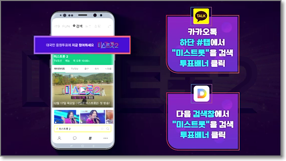 1. 카카오톡 하단 #탭에서 '미스트롯'을 검색, 투표배너 클릭