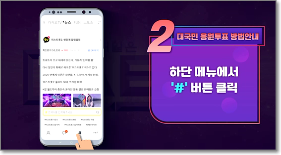 미스트롯2 대국민 응원투표 방법 안내 드립니다.   1. 스마트폰 공식 투표 모바일앱 (카카오톡) 접속   2. 하단 메뉴 중 3번째 # 선택   3. 상단에서 #카카오TV 선택   4. #카카오TV 내에 있는 미스트