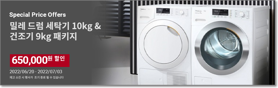 밀레 드럼 세탁기 10kg & 건조기 9kg 패키지 : 4,799,000원 (65만원 할인)