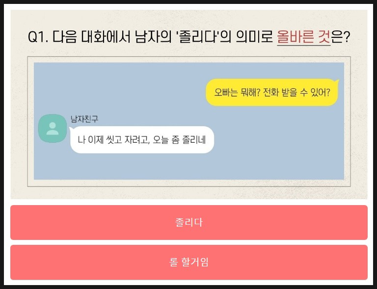 연애언어능력고사 - vonvon 링크 https://kr.vonvon.co/quiz/19479 연애 언어 능력고사 카톡하는 센스를 보면 연애 확률이 보인다!! kr.vonvon.co - 여자편 - 남자편