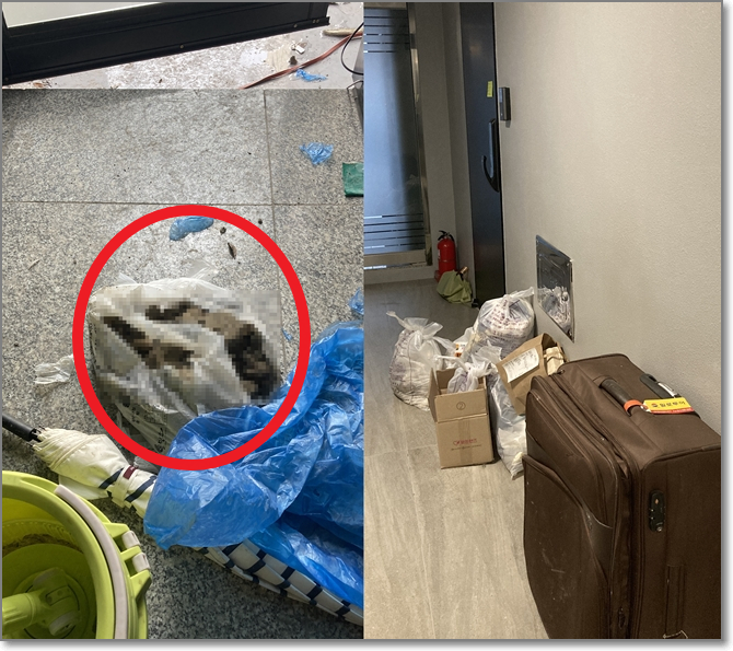쓰레기 봉투가 찢어지거나 아무렇게 던져놓아 고양이 배설물이 복도에 흩뿌려져 있네요.