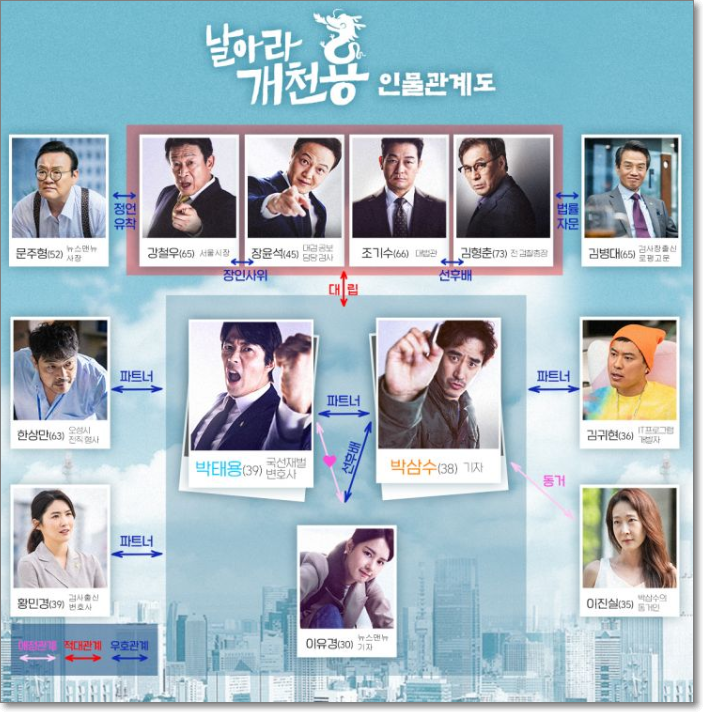 억울한 누명을 쓴 사법 피해자들의 목소리를 세상에 대변하는 두 남자의 뜨거운 이야기를 그린 날아라 개천용은 고졸 국선 변호사와 투박하지만 글발 하나로 사대문을 접수한 백수 기자의 반전의 역전극을 유쾌하면서도 짜릿하게 그렸습니다