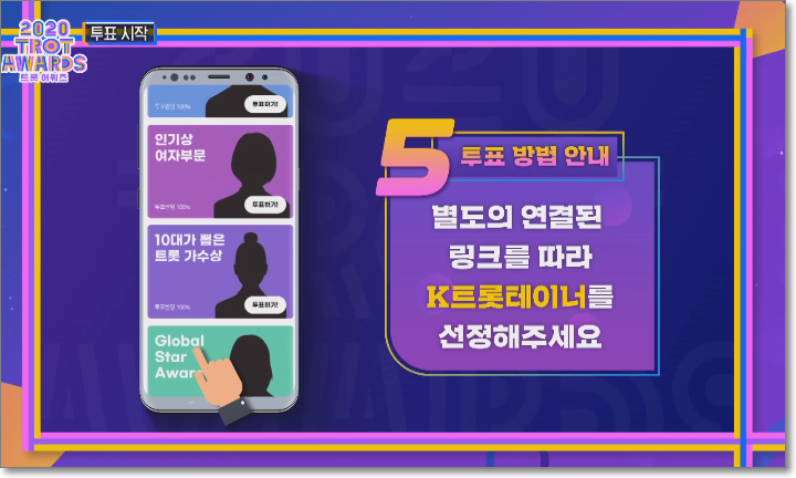 ▶ 인기상 남자-여자 부문과 만 19세 이하만 참여 가능한 10대가 뽑은 트롯 가수상을 비롯해 글로벌 스타상 부문으로 진행됩니다.