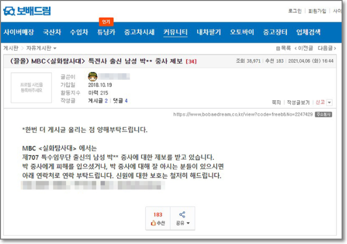 당초 그의 하차 사유는 ‘비난 악플로 인한 심적 고통’으로 추정되었는데, 일부에서는 또 다른 의혹이 제기되었습니다. 바로 박 중사가 다른 사람들에게 어떠한 피해를 입혔고, 그게 공론화 될까봐 자진하차 했다는 의혹인데요. MBC 실화 탐사대가 박** 중사 관련 제보를 받았다고 합니다.