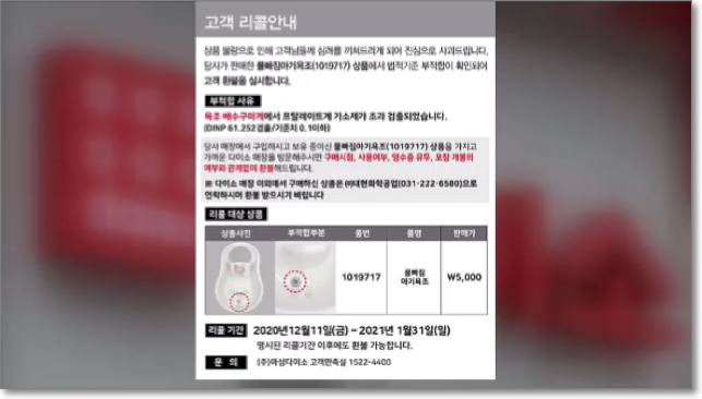 다이소는 내년 1월 31일까지 해당 제품을 가지고 매장을 방문하면 사용 여부, 영수증 유무와 관계없이 환불받을 수 있다고 설명했습니다.