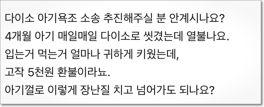 '다이소 아기 욕조’에서 유해물질이 기준치의 600배가 넘게 검출된 것으로 밝혀지면서 논란이 확산되고 있습니다. 아성다이소는 자사 매장에서 판매한 아기 욕조에서 안전 기준치의 600배가 넘는 유해 물질이 검출돼 환불 조치 한다고 밝혔습니다. 좀 더 자세한 내용과 환불 방법 안내드리겠습니다.