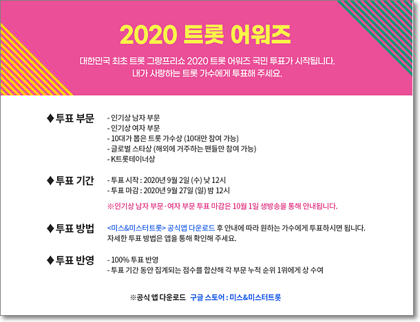 2020 트롯 어워즈 투표는 미스&미스터트롯 어플에서만 가능합니다.