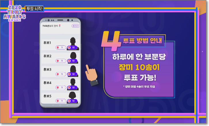 투표 방법은 기존의 전화 투표와는 다른 방식이며 TV 조선과 네오위즈가 함께 트롯 앱을 출시했습니다.