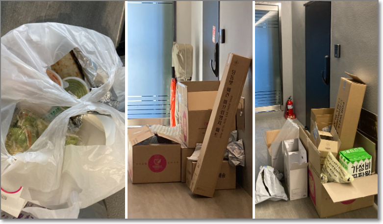 그리고, 배달음식 용기는 복도에 방치하지 말고 씻어서 분리수거해달라 부탁하니 복도가 아닌 분리수거장에 음식물 들어있는 용기를 아무렇게나 내다버려 엉망이랍니다.