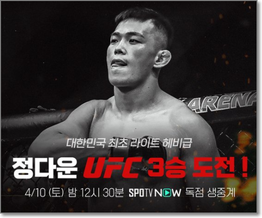 오랜만에 UFC 경기가 열립니다. UFC 파이트 나이트에서 정다운 선수의 경기가 열리는데요. 4월 11일 새벽 1시에 시작합니다. 자세한 시청 방법 안내드리니 아래를 통해 무료시청 바랍니다.