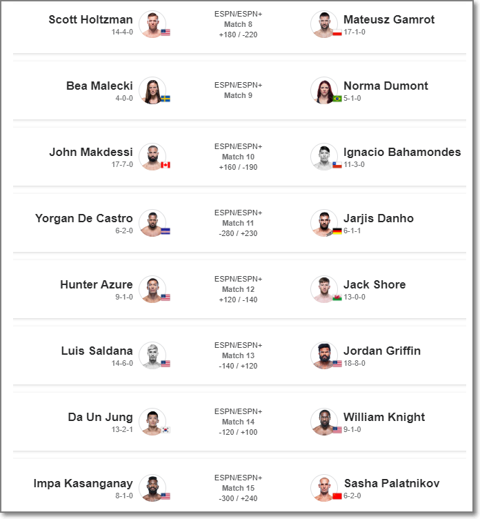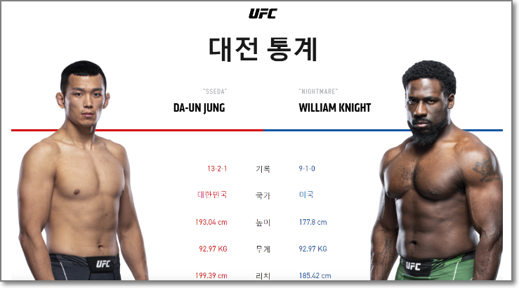 정다운의 상대 윌리엄 나이트는 '데이나 화이트 컨텐더 시리즈' 출신으로 MMA 통산 9승 1패를 기록중입니다. 지난해 9월 UFC 계약서를 따냈고, 곧바로 치러진 데뷔전에서 만장일치 판정승을 기록했습니다.